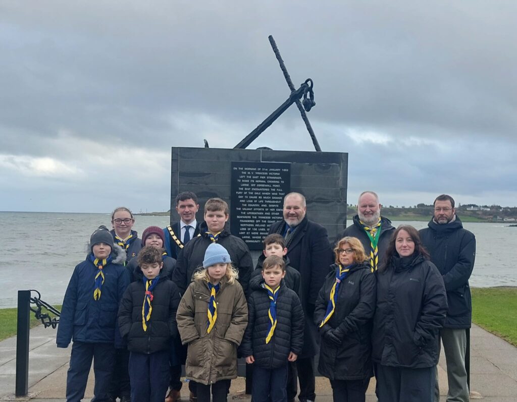Cubs and Scouts from 7th Larne braved challenging weather to attend the annual M.V. Princess Victoria memorial service in Larne.